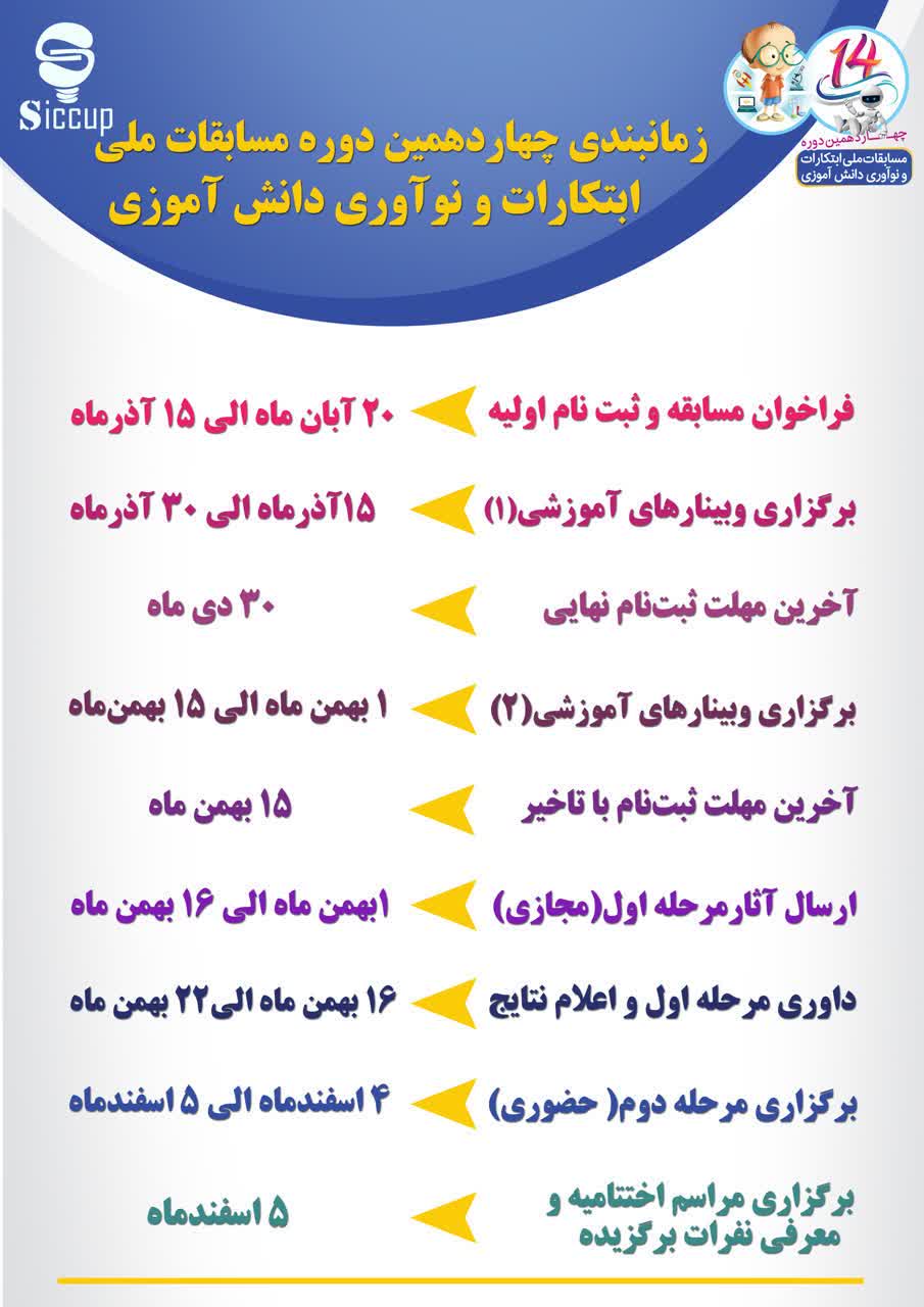 جهت دریافت فایل زمانبندی چهاردهمین دوره مسابقات ملی ابتکارات و نوآوری دانشآموزی کلیک کنید